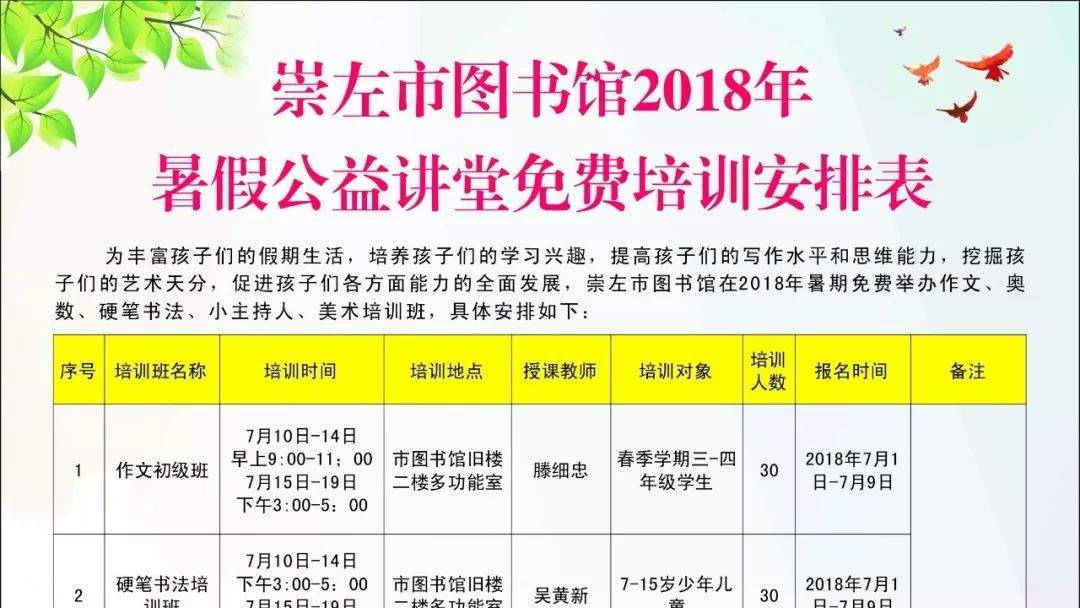 2018年暑假公益讲堂免费培训安排表