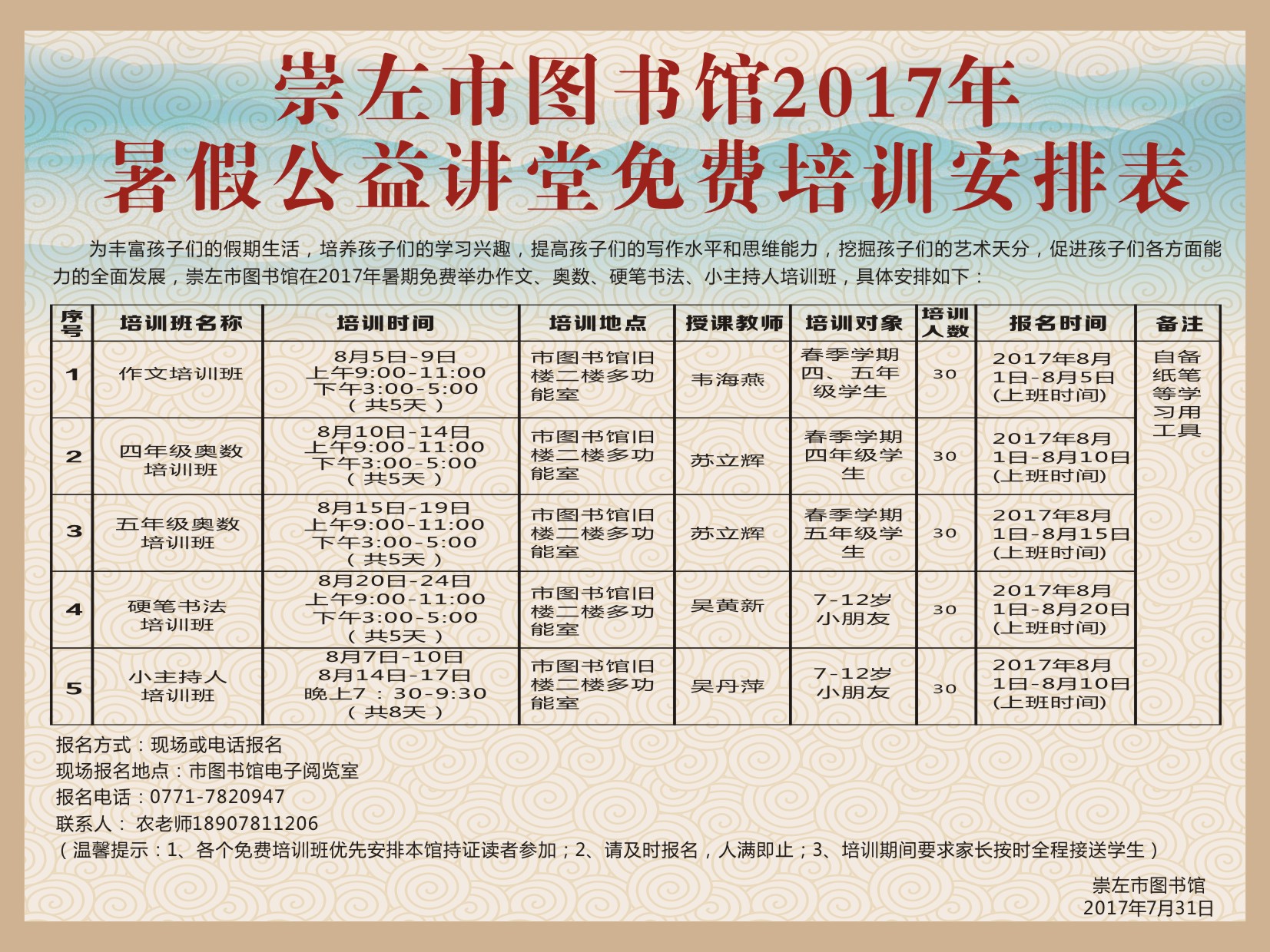 我馆2017年暑假公益讲堂免费培训安排表