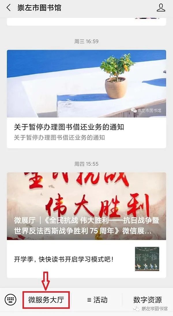 一、关注崇左市图书馆微信公众号