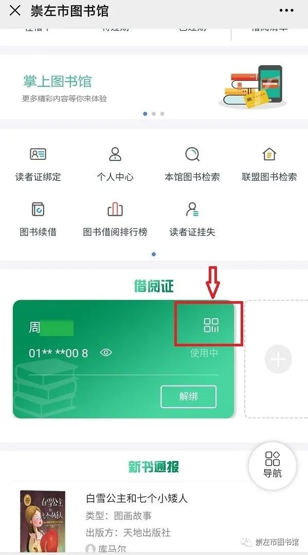 绑定成功后点击电子读者证上的二维码标识,获取个人二维码