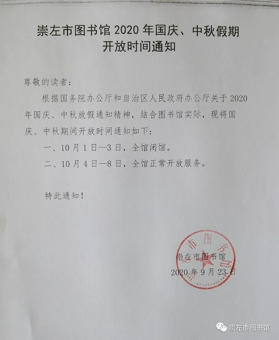 根据国务院办公厅和自治区人民政府办公厅关于2020年国庆、中秋放假通知精神,结合图书馆实际,现将国庆、中秋期间开放时间通知如下: