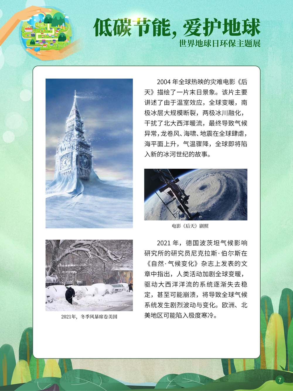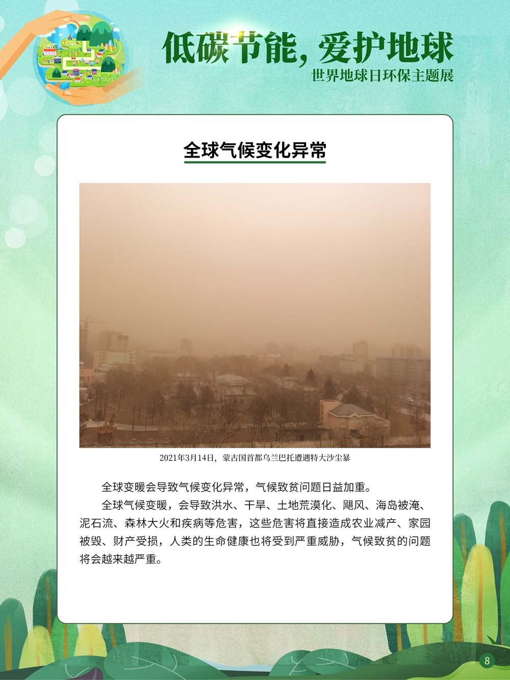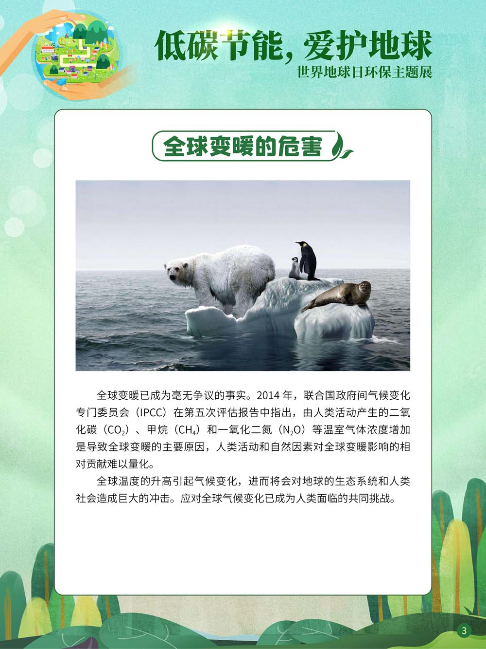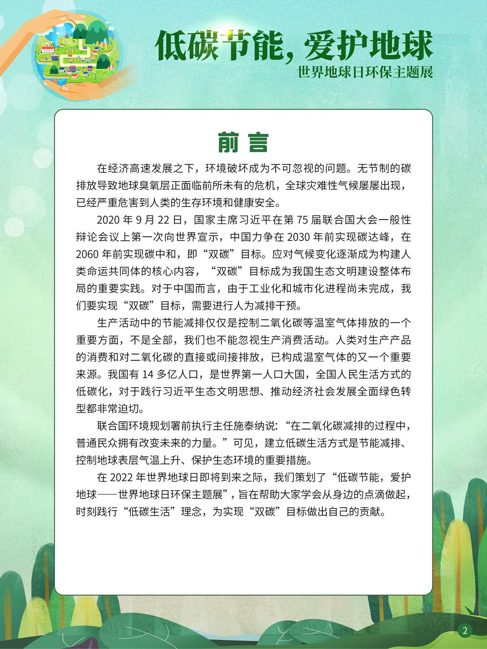 在经济高速发展之下,环境破坏成为不可忽视的问题。无节制的碳排放导致地球臭氧层正面临前所未有的危机,全球灾难性气候屡屡出现,已经严重危害到人类的生存环境和健康安全。作为负责任的大国,中国已经明确提出“力争在2030年前实现碳达峰,2060年前实现碳中和”的目标。然而所谓“碳达峰”“碳中和”究竟是什么?它们又与我们的生活有何关系?在2022年世界地球日即将到来之际,我们策划了“低碳节能,爱护地球——世界地球日环保主题展”,旨在帮助大家学会从身边的点滴做起,时刻践行“低碳生活”理念,为实现“双碳”目标做出自己的贡献。