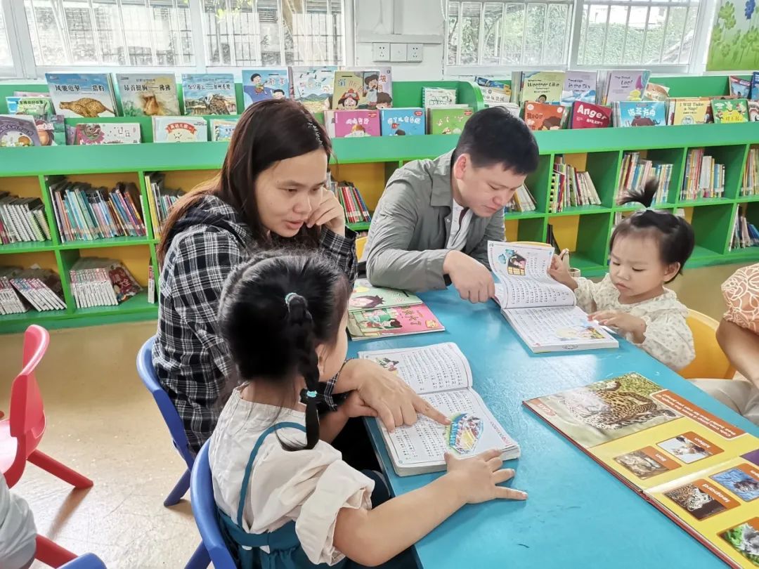 小朋友们和爸爸妈妈一起在幼儿阅览室看有趣的绘本,畅游书海。