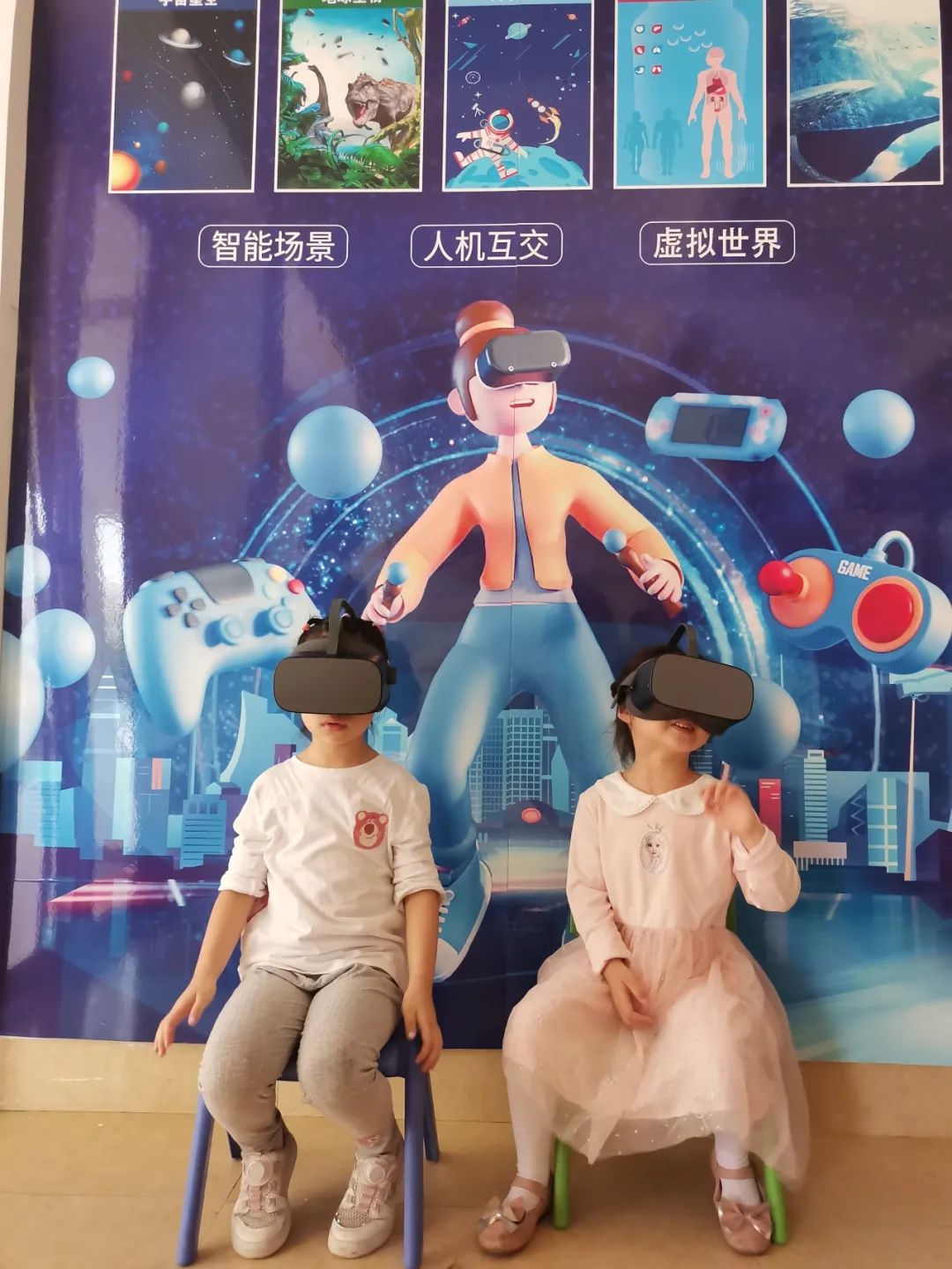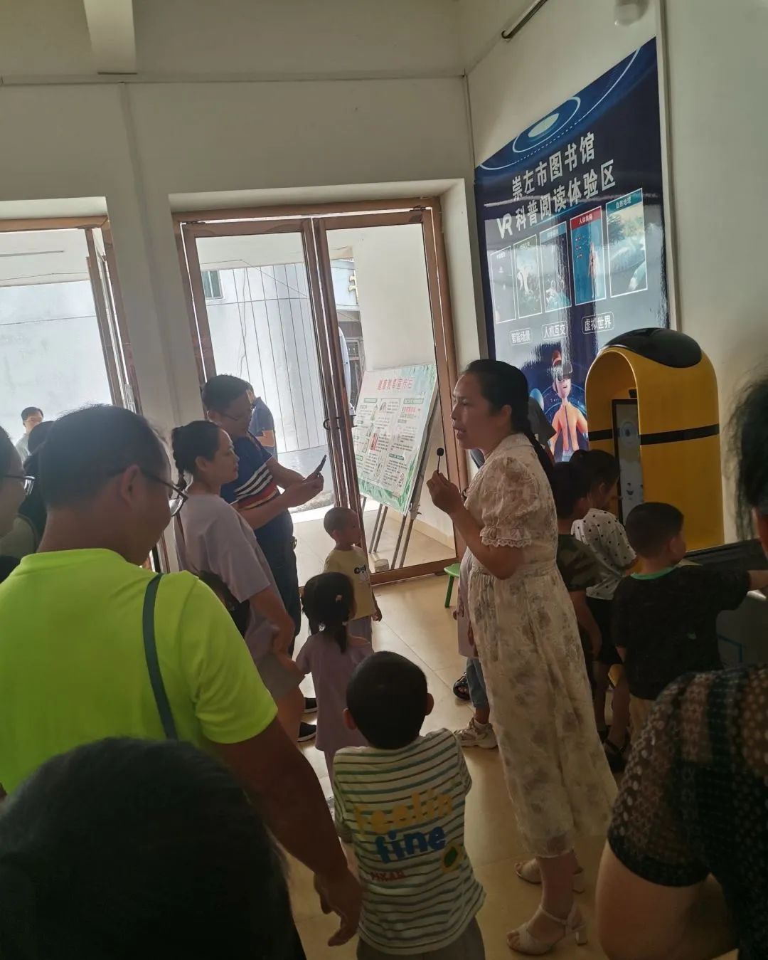 小朋友们听图书馆老师介绍VR科普阅读体验活动,并带上VR眼镜,亲身体验VR科普阅读。