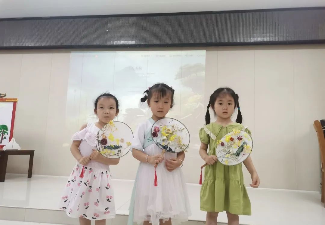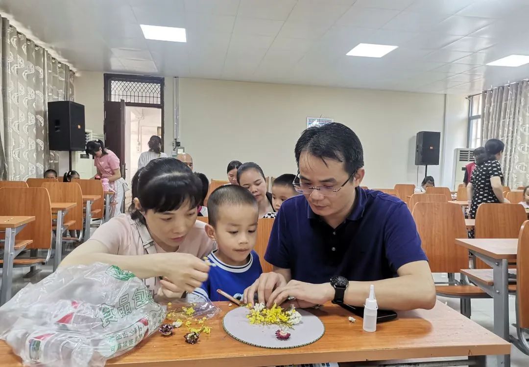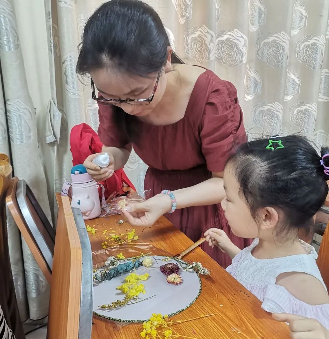 小朋友和爸爸妈妈一起制作花团扇手工。
